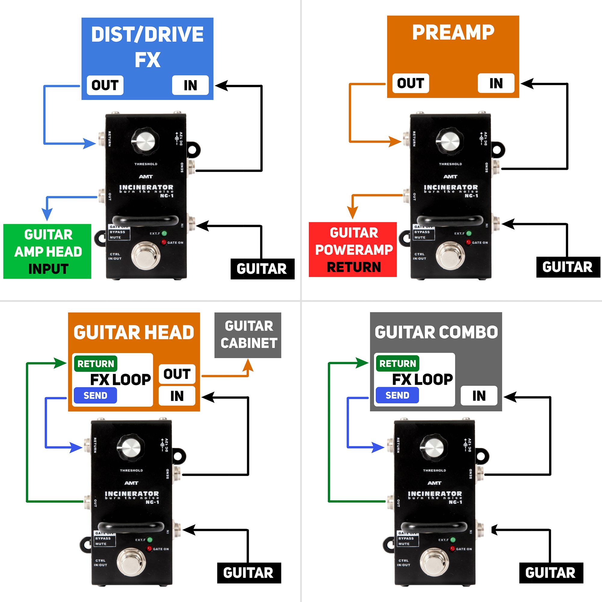 При включении педали "перегруза" или преампа в петлю, управление детектором осуществляется непосредственно сигналом гитары, а управляемый аттенюатор располагается уже после выхода преампа или педали перегруза. Таким образом, уровень шумоподавления устанавливается один раз и является эффективным для любой педали перегруза или канала преампа.
