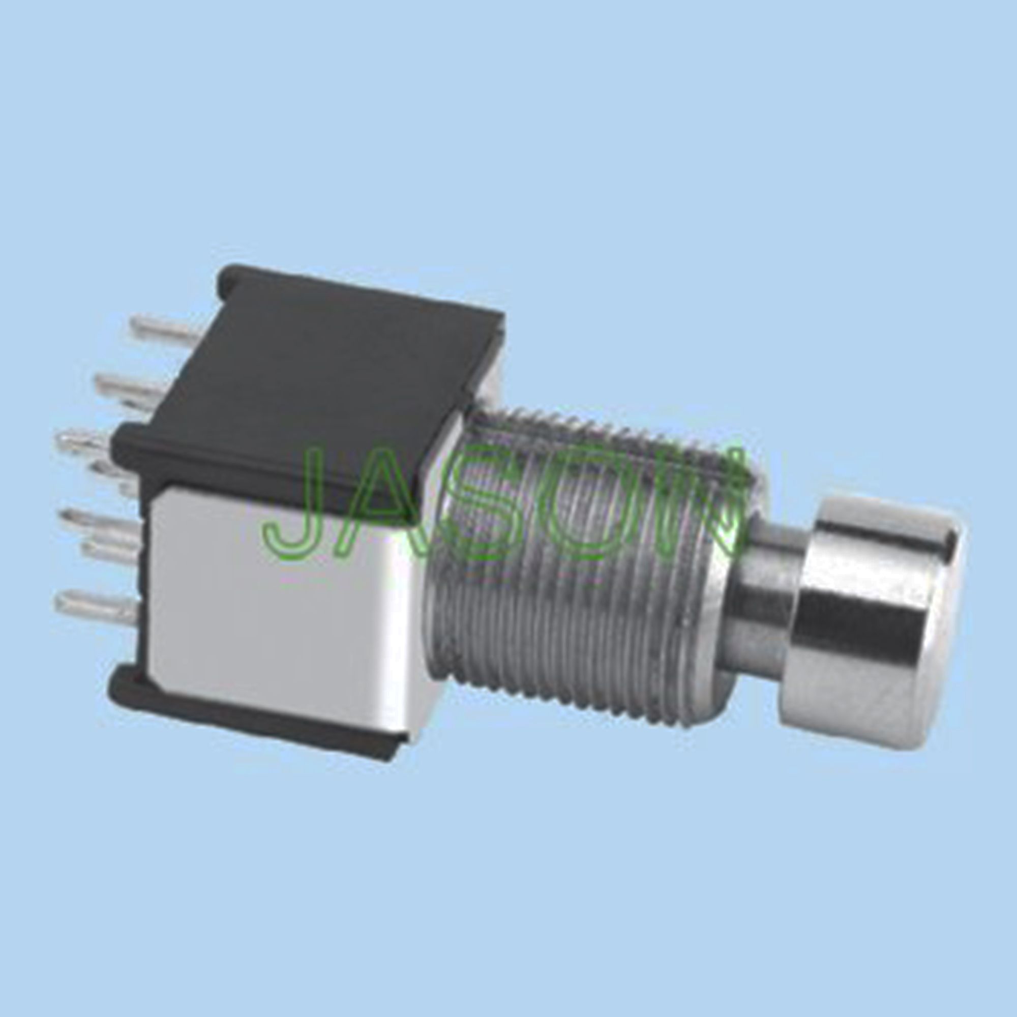 Данная кнопка имеет 9 контактов (три группы), переключение — с фиксацией положения.