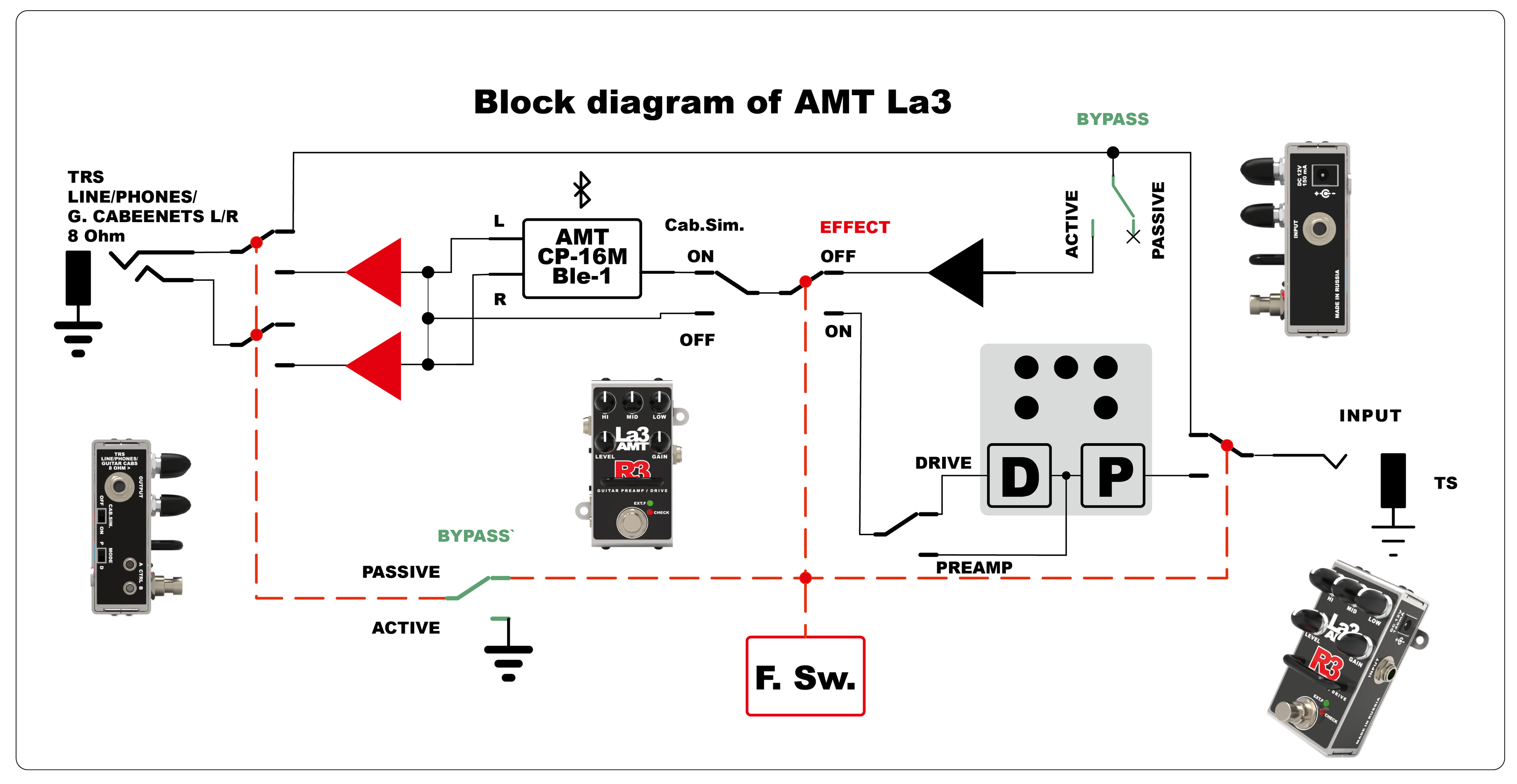 Cерия девайсов LA3 Light также унаследована от линейки преампов AMT Bricks гибкие возможности взаимной коммутации педалей без использования сторонних свитчеров / переключателей / коммутаторов.