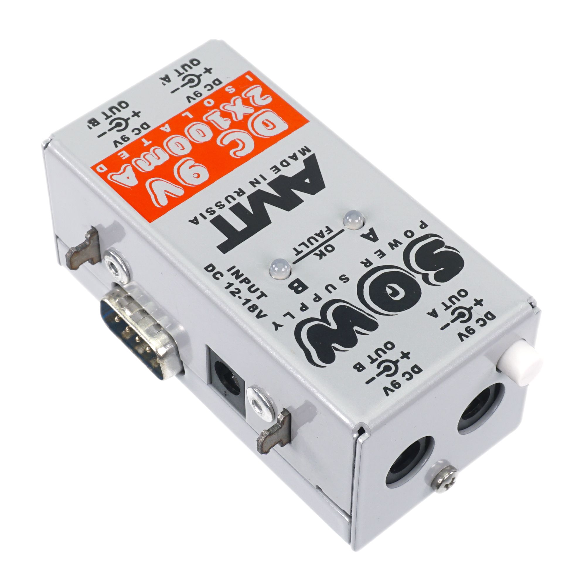 Гальванически изолированный от первичного электропитания модуль с двумя выходными, гальванически изолированными друг от друга напряжениями (DC-9V), предназначен для питания 9-и Вольтовых гитарных педалей, потребляющих не более 100 mA, таких как AMT Electronics- преампы серии LA, гитарные эффекты FX, педали перегруза DRIVE.
