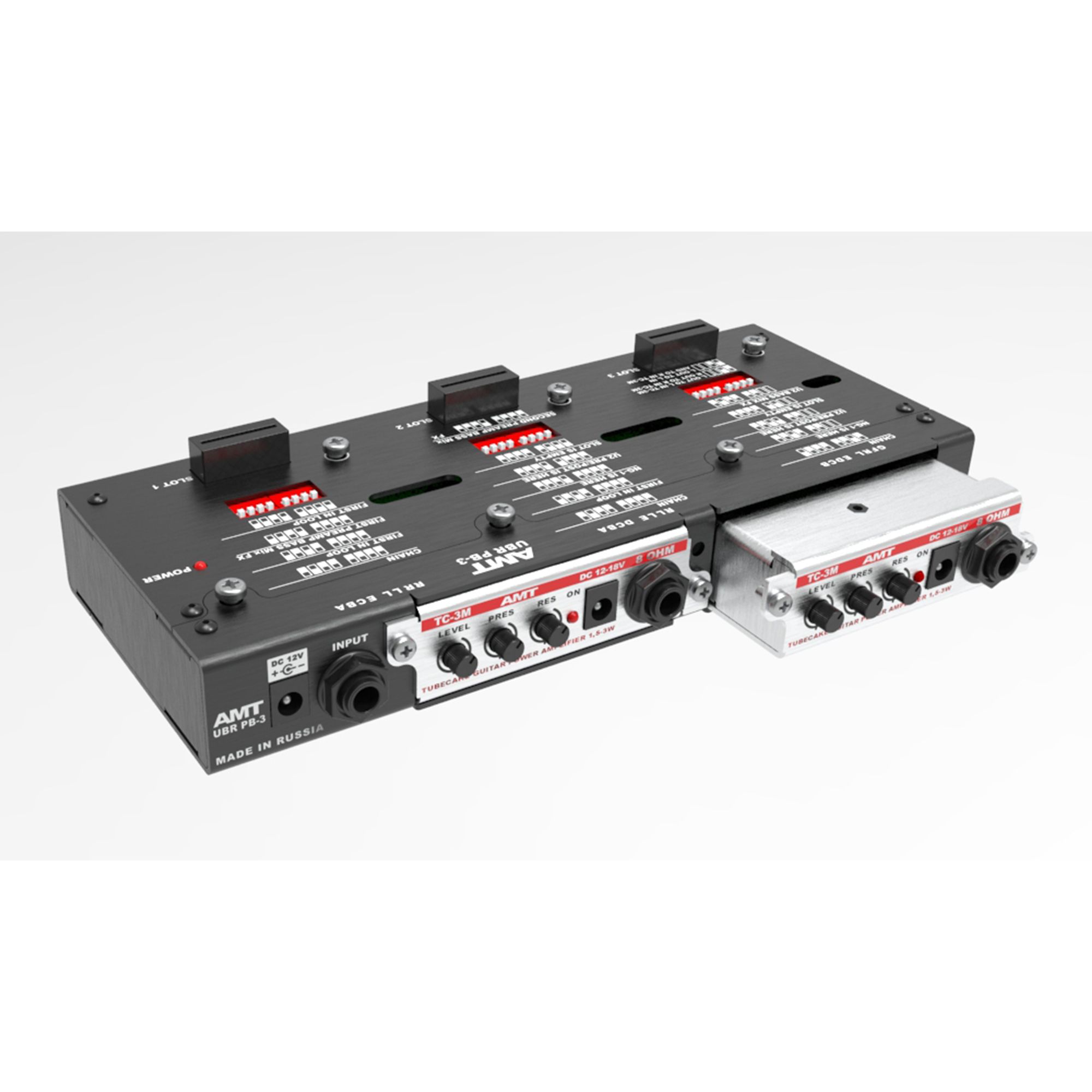 AMT UBR PB-3 — это платформа-педалборд для размещения любых 3-х устройств линеек AMT Bricks / LA3 Light / LA3 Light BLE.