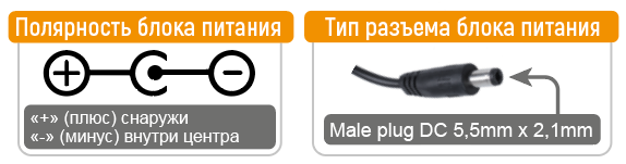- Полярность разъема питания DC: минус внутри, плюс снаружи